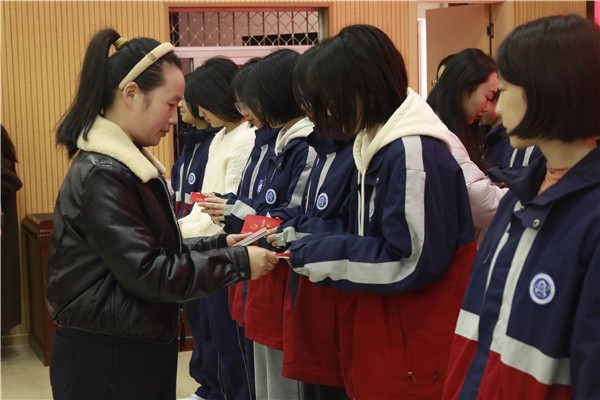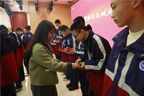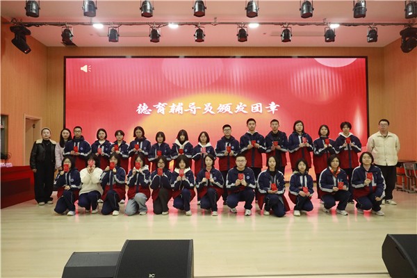 颁发团章,铭记使命 在庄重的乐曲声中,文娜娜以及各年级德育辅导员老师——周颖、夏紫琳、李艳琼、殷长琳、张瑞坤,校团委陈琳老师为学员代表颁发了团章。当同学们双手接过这本象征着光荣与责任的红色小册子时,脸上写满了庄严与坚定。从这一刻起,同学们将以更高的标准要求自己,让团章成为青春路上的“指南针”。
