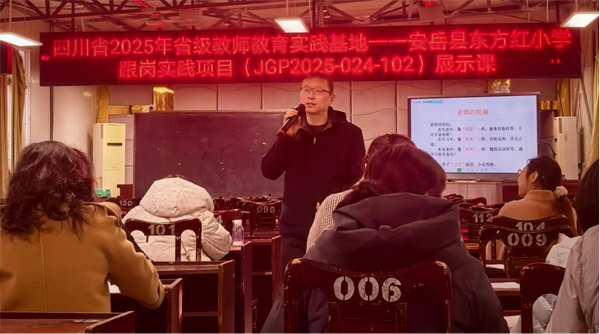 2025年12月2日上午,安岳县东方红小学学术厅内座无虚席,该校全体数学教师齐聚于此,共同参与四川省2025年省级教师教育实践基地跟岗实践项目展示课活动。活动由东方红小学教务主任张永科主持,东方红小学骨干教师罗小平、袁娜、彭媛;跟岗学员兴隆小学刘雪莲、卧佛小学周燕梅等一同参与。本次活动以“教学成果落地、校际经验互鉴”为核心,旨在检验跟岗学员的教学设计与课堂实践能力,同时推动区域数学教师专业交流。 李宇轩老师的课堂以“点的运动”为核心逻辑,融合“探究式学习”与“结构化思维培养”理念,从“生活中的线(手电筒光线、铅笔线条)”情境导入,逐步引导学生通过“点的运动创造线段”“线段一端无限延伸形成射线”“线段两端无限延伸得到直线”,层层深入构建三线概念;随后通过小组合作列表对比三者异同,强化概念区分,并巧妙融入“做事像线段有始有终、学习像射线有始无终、想象像直线无始无终”的品格隐喻,实现学科素养与德育的有机融合。