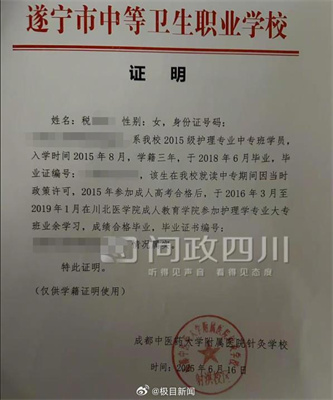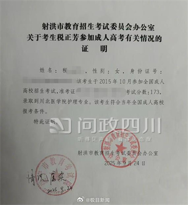 近日,四川射洪市1999年出生的税女士在问政四川求助称,她参加2025年上半年射洪市事业单位考试,并获得医疗岗位综合成绩第1名的成绩,但在政审过程中因“中专与成人大专学历时间重叠”,被判定不合格。 税女士介绍,她中专于2015年-2018年就读成都中医药大学附属医院针灸学校,成人大专则于2015年10月报考川北医学院护理专业,并于2016年至2019年通过学习获得毕业证。 她在参加事业单位考试时,笔试面试阶段学历材料均审核通过,政审阶段射洪市卫健局认为此为“学历套读”属于违规,口头解释其不合格。 11月28日,射洪市12345政府服务热线受理中心回复道,根据《四川省2015年成人高校招生工作的通知》,成人高考报名条件一栏明确是“国家承认学历的各类高、中等学校在校生以外的从业人员和社会其他人员”。税女士在报考时,正在成都中医药大学附属针灸学院中专就读,与招考简章内的报考条件相违背。 税女士在问政四川上展示了多份证明材料。其中成都中医药大学附属针灸学院出具的证明写道,税女士系该校2015级护理专业中专班学员,入学时间2015年8月,学籍三年,于2018年6月毕业。该生在该校就读中专期间因当时政策许可,2015年参加成人高考合格后,于2016年3月至2019年1月在川北医学院成人教育学院参加护理学专业大专班业余学习,成绩合格毕业。 射洪市教育招生考试委员会办公室出具的证明也表明,该考生于2015年10月参加全国成人高校招生考试,录取到川北医学院护理专业。该考生符合当年全国成人高校报考条件。 12月3日,记者就此咨询射洪市卫生健康局人事部门,工作人员表示,相关情况由该科室相关负责人负责。 记者注意到,2024年四川南充一位网友也咨询了类似问题,其表示中专学历与大专学历存在学历时间重叠(2010年7月中专已毕业,大专2009年9月就开始了),在未取得中专学历时就开始了大专的学习,担心参加公务员、事业单位考试时影响政审。 南充市人社局答复该网友称,在事业单位招聘中,学历是否符合招聘要求,主要审查学历取得渠道和学历证书是否符合国家教育行政主管部门相关规定;政治审查具体内容,以招聘公告中关于考察环节的要求为准。
