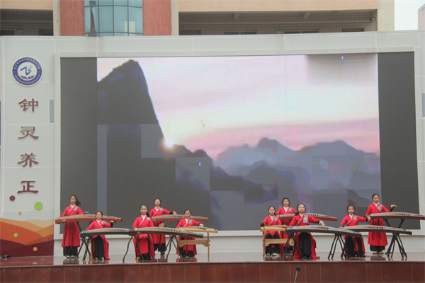 为丰富课后服务内容,展现学生多元风采,12月26日,宜宾市南溪区钟灵街小学校四点钟课堂展演活动在校园操场精彩上演。活动聚焦各社团特色成果,其中古筝社团的表演尤为亮眼,古韵悠扬的筝声为校园增添了浓郁的文化气息。 展演现场,古筝社团的同学们身着整齐的红色演出服,端坐于古筝前,指尖轻拨琴弦,旋律便如流水般倾泻而出。背景大屏上“赤胆悬弓塞月寒,旌旗裂甲未曾还”等豪迈诗句与激昂的筝曲相互映衬,同学们将传统乐曲的意境与少年意气融合,时而铿锵有力,奏响家国情怀的激昂篇章;时而婉转悠扬,勾勒出古典韵律的唯美画卷。娴熟的演奏技巧、专注的表演状态,赢得了现场师生的阵阵掌声。