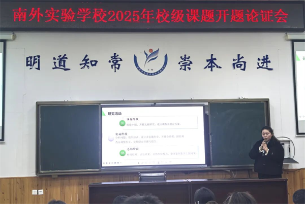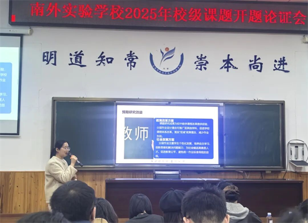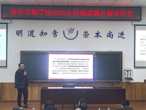 为进一步落实立德树人根本任务,推动课堂教学改革,提升教师教育科研水平,近日,宜宾市南溪区南外实验学校校级课题开题报告专项活动顺利开展。本次报告会由教学中心副主任付芳菲主持,副校长周媛、校长助理程瑞俊和人力资源中心主任李银进行指导,语文、数学、化学课题组成员及部分教师代表共同参与。 会议伊始,主持人付芳菲老师阐述了本次开题报告会的重要意义。她指出,校级课题是教师专业成长的“练兵场”,是解决教学实际问题的“金钥匙”。她希望各课题组能以严谨的态度、科学的方法开展研究,确保课题研究过程扎实、成果丰硕,真正服务教学,惠及学生。