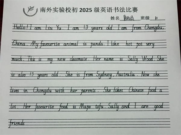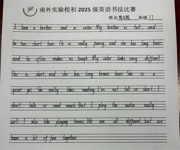 为帮助初一新生夯实英语学习基础,培养规范书写习惯,感受英语文字的结构之美,11月11日,南外实验学校特举办初一年级英语书写比赛。在一笔一画之间,书写的不只是句子,更是态度;在字里行间之中,展现的不只是技巧,更是初心的温度。