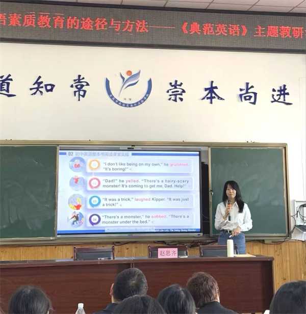 专家引方向 赋能新征程 课例展示结束后,北京外国语大学赵思奇博士带来专业点评与专题讲座。赵思奇首先对两节研讨课给予高度评价,充分肯定了两位老师的课堂设计、教学方法以及对《典范英语》绘本教学的精准把握,同时结合课堂细节,从教学目标设定、课堂活动设计、学生素养培养等方面提出了针对性的改进建议与教学思路,为老师们后续开展英语阅读教学指明了方向。 随后,赵思奇以我国基础英语素质教育的途径与方法为主题,立足教育前沿,深度解读英语素质教育核心要义,分享专业教学策略,为在场教师带来一场兼具理论高度与实践价值的教育盛宴,助力教师拓宽教学视野、提升专业素养。