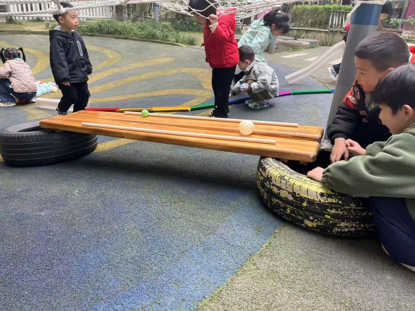 户外活动时,孩子们在凹形章鱼池发现一颗海洋球,兴奋地尝试扔、踢、滚等玩法。教师敏锐捕捉到兴趣点,次日投放大量海洋球,并在回顾环节抛出问题:“海洋球还能怎么玩?”孩子们七嘴八舌地讨论起来,最后决定:“修一个海洋球赛道!”于是,一场关于“管道搭建”的工程挑战正式开启。 思哲和同伴先用木板搭建直线赛道,随后尝试用U型管拼接。面对管道分离、球体卡住的问题,孩子们通过调整间距、对齐方式、叠放顺序(如“从上往下叠放”更顺畅),最终让海洋球顺利滑落。孩子们在科学探究中理解结构对运动的影响,通过同伴合作解决问题。 有了直线赛道经验,孩子们挑战用软管搭建转弯赛道。三次尝试中,他们从“对齐失败”到“积木辅助固定接口”,创造性地用第三方材料解决立体空间衔接问题。孩子们在试错中学会灵活调整策略。
