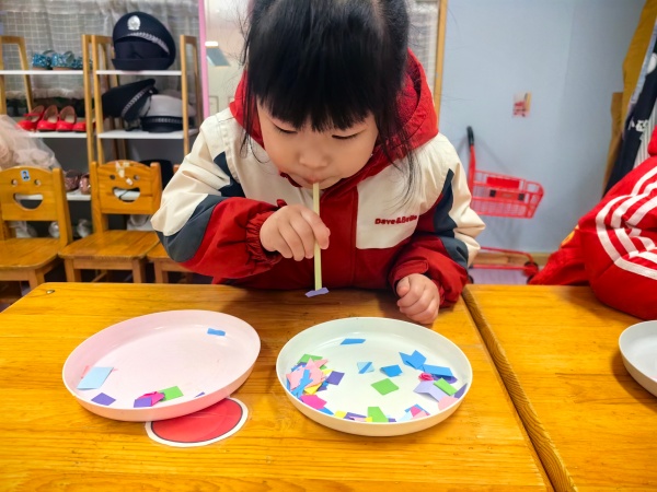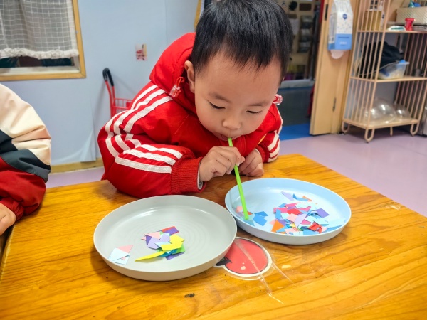 探索二:吸管巧益智 小朋友们用吸管玩起了“数一数、分分类、排排队”等有关的小游戏。通过小游戏培养幼儿的观察力和专注力。帮助孩子建立颜色认知,提升对数字的认知和逻辑思维能力。同时,动手操作锻炼幼儿的手眼协调能力,在趣味中开启数学启蒙之旅。 探索三:毛毛虫 “小吸管真好玩”,小朋友们起劲儿地拍手叫到!我们顺势做了许多毛毛虫,开始了“吹毛毛虫”大比拼游戏。 探索四:吸 孩子们一起玩“吸”的探索游戏。小纸片太不听话了,无论怎么都吸不上来,但是他们都没有放弃非常努力地忙活着。哈哈,终于掌握方法啦!只见张孝贤对准小纸片用力一吸,小纸片乖乖地吸起来了,他迅速地放到另一个盘子里。看到自己成功啦,他高兴地跳了起来,其他小朋友们也慢慢都吸起来了。看他们玩得多带劲儿! 吸管吹泡泡 清水加上洗洁精轻轻搅拌一下用吸管轻轻地吹,神奇的事情就发生了。当孩子们把吸管伸进彩色液体,轻轻一吹,满是泡泡的“魔法秀”就上演啦!孩子们在吹气的瞬间,亲眼看见泡泡冒起、飘散,既锻炼了口腔肌肉,又在玩中感知了气流的奇妙。简单的材料让科学探索变得像游戏一样轻松,每一次泡泡的绽放,都是他们对世界的好奇在发光。
