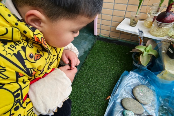 4.小鱼生病啦! 这天下午芯妤突然着急地大喊:“老师,有条小鱼身上长了白白的毛毛!”小朋友们立刻围过来,满脸担忧。“别急,我们一起帮它。”那怎么帮助小鱼恢复健康呢?我们邀请家长和小朋友一起收集办法。 经过孩子们收集的办法,我们把生病的小鱼单独喂养,每天小心地为它换水,添加淡盐水,还去找到保健老师要了碘伏、棉签,用棉签蘸着稀释后的碘伏轻轻擦拭伤口。接下来的日子,孩子们更细心了,每天都会来看看小鱼。 教师思考: 养小鱼是一次有趣的科学探究,更是幼儿生命教育的生动实践。从布置小鱼新家,到幼儿日常喂养小鱼,孩子们在分工合作中培养了责任感。面对小鱼生病等突发问题,我没有直接代劳,而是引导孩子们积极救治小鱼,将对小鱼的同理心,转化为具体的关爱行动。小鱼的康复过程,让孩子们真切体验到生命的韧性,通过与小鱼共同成长的真情实感,幼儿萌发了珍爱生命、呵护弱小生命的美好情感。 镜头五:小鱼怎么啦? 一天清早,子辰入园后跑到植物角观察小鱼,他大声惊呼:“呀,小鱼怎么啦?”孩子们纷纷围过来,他们发现一条小鱼在一动不动地躺在水池边。奕晨问:“小鱼怎么不动了?”星洁说:“它是不是死了?”我轻轻安抚孩子们:“别着急,我们一起想想办法找出原因。”孩子们仔细观察水池周围,大胆猜想小鱼之死的可能原因:“是不是猫把小鱼咬死的呀?”“我觉得是老鼠,老鼠会偷东西,说不定也咬小鱼。”“会不会是妖怪干的?”孩子们你一言我一语,在思考中慢慢从悲伤情绪里走出来,开始积极寻找小鱼死了的真相。 教师思考: 面对小鱼死亡的突发事件,我没有直接告知幼儿答案,而是用问题引导幼儿将悲伤情绪转化为科学探究动力。孩子们发挥丰富想象力,大胆猜测猫、老鼠、妖怪等,展现了活跃的思维与求知欲。我借机引导幼儿仔细观察小鱼生活周边,培养幼儿科学探究能力,在自然情境中开展生命教育,帮助孩子们初步理解生命成长的自然现象。