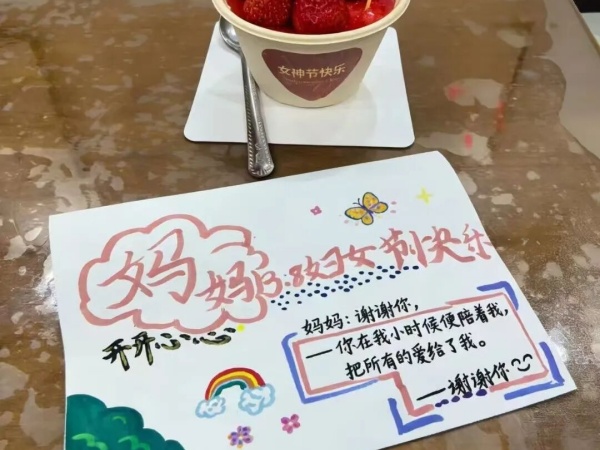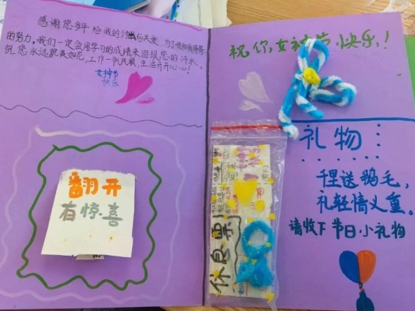 低段:小小贺卡,满满心意 “我要把最漂亮的花送给妈妈!”“老师,您辛苦了,这是我画的贺卡!”在教室里,孩子们正拿着彩笔、卡纸,认真地绘制着祝福卡。一张张稚嫩的作品,承载着孩子们纯真的爱。当这些亲手制作的贺卡送到女性长辈和老师手中时,那份惊喜与感动,化作了最温暖的笑容。