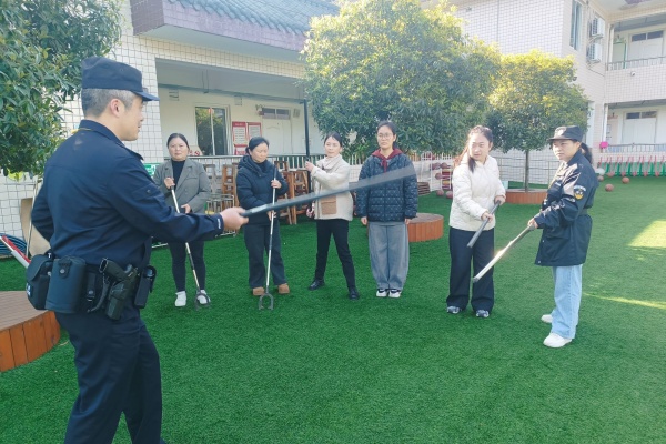培训中,派出所民警结合校园实际场景,围绕应急处置流程、防暴器材使用、最小应急单元分工、突发情况快速响应等内容进行细致讲解,现场示范盾牌、钢叉、警棍等器材的规范操作,明确各岗位人员职责,提升教师应急协同能力。