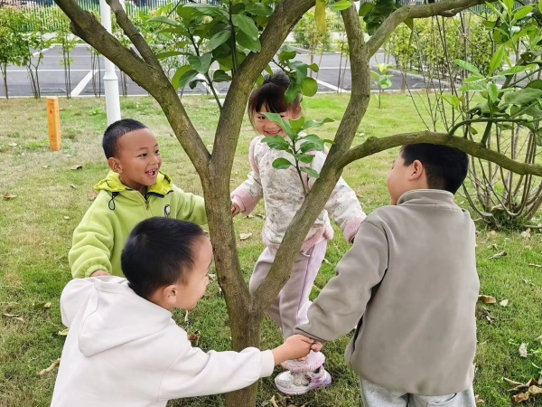 在百果园里,每一棵果树都有自己的名字和故事。橘子树“金灯笼”是百果园的元老,也是课程的见证者。那年春天,孩子们握着小铲子把它种下,从此它的年轮便和这片园子一同生长。柿子树“甜甜”是去年冬天搬来的新成员,虽然还未结果,但孩子们每天都来看它,趴在树干上问:“甜甜,你今天长高了吗?”嘉宝果树“巧克力”不走寻常路,果子不长在树枝上,而是密密麻麻长在树干上,孩子们总好奇地问原因。