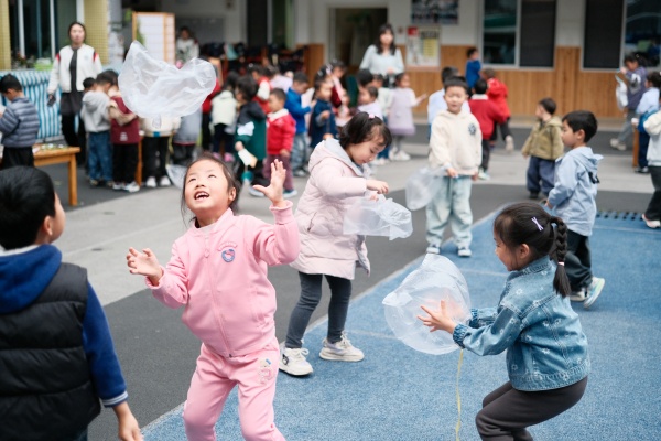 你听操场上传来的是,孩子们用普通塑料袋,和春风一起躲猫猫的嬉笑声。草地上是小小孩们努力跃起的呐喊声,当游戏回归到花草、追风……等自然元素。教育的真谛便在沾满草汁的掌心悄然显影。