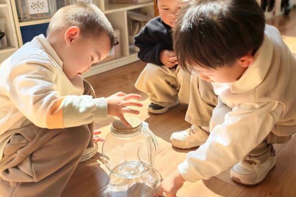 活动源于一次餐后散步的偶然发现。阳光明媚的午后,孩子们惊喜地发现影子会跟随自己移动,纷纷模仿螃蟹、兔子等造型,与影子快乐互动。基于孩子们对影子的浓厚好奇,一场关于“光影”的探秘之旅正式开启。 活动中,教师带领幼儿共读绘本《影子》,初步了解影子的形成原理,让孩子们知道影子是光的“好朋友”,有光的地方就有影子。随后,孩子们化身“小小探索家”,在幼儿园里开启寻影之旅:楼梯间栏杆的影子、草坪上树叶的影子、教室里玻璃瓶的影子……无处不在的影子让孩子们惊叹不已。
