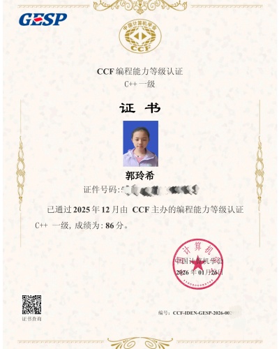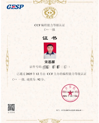 尤为可喜的是,在参加认证的学员中,三名同学成功通过C++一级认证,这标志着他们已牢固掌握了该级别的核心编程概念与实践技能。其中宋思源同学表现优异,凭借其超前的知识储备与出色的逻辑思维能力,更是达到了跨级报考的水平,这充分彰显了该校学生在编程领域的卓越天赋与课程培养的有效性。
