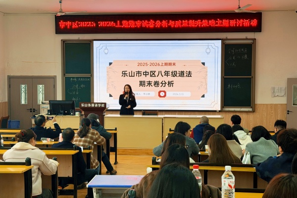 为进一步深化教学改革,精准把握教学方向,全面提升道德与法治学科教学质量,3月13日,乐山市市中区道德与法治学科“期末试卷分析与质量提升策略”主题教研活动在乐山外国语学校举行。活动由区教研员王明强主持,全区道法教师参会,设公开课、评课议课、专题讲座等环节,以研促教、精准施策,助力学科教学提质增效。