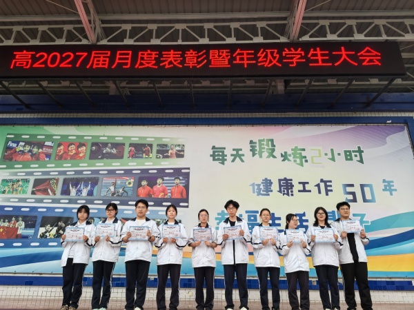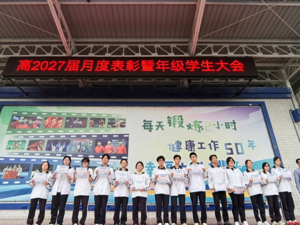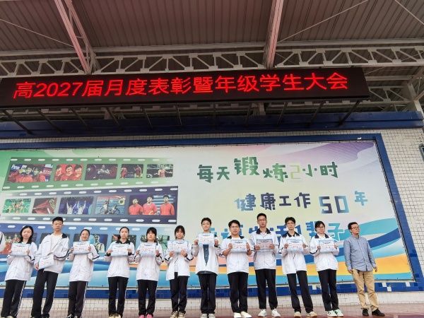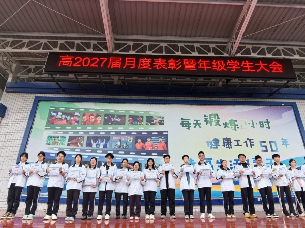 研学砺志承风骨 表扬领航启新程 教师大会结束后,高2027届全体师生齐聚操场,召开高二下期4月学生大会。本次大会以“清醒·担当·笃行”为主题,在回望中凝聚力量,在表扬中树立标杆,会议由校长助理兼年级组长周艳主讲,副校长谢红军及高2027届全体师生参会。 大会首先对四月初重庆研学活动及三月月考进行总结表扬。三天研学之旅,学子们以脚步丈量山城脊梁,在渣滓洞前感悟先烈信仰,在山城璀璨灯火中感念岁月静好。周艳勉励同学们将研学收获转化为成长担当,将历史敬畏融入日常奋斗。月考颁奖环节,她寄语学子:“月考虽已落幕,奋斗永不止步。愿获奖同学不骄不躁,暂未达标的同学奋起直追,在最美的四月天里拔节生长。”