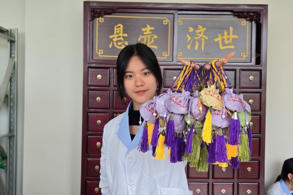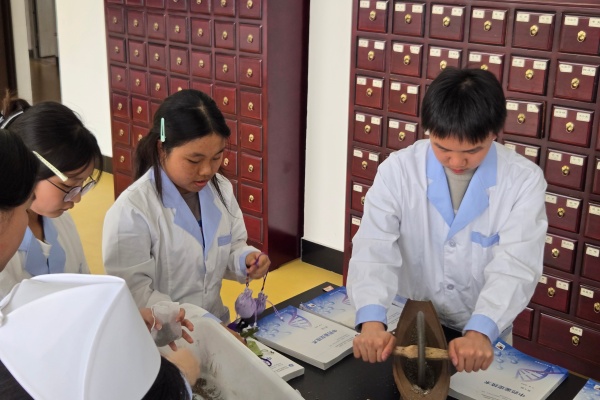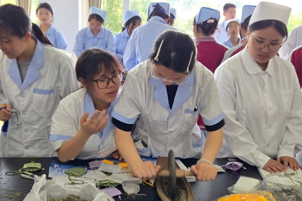 活动伊始,专业教师围绕中药香囊的历史渊源、文化内涵、药用功效进行全面讲解,结合中医药专业知识,细致介绍香囊常用药材的特性与配伍原理,让同学们在动手操作前,先明晰背后的中医药理论支撑。随后,教师现场规范演示中药香囊制作全流程,从道地药材甄选、精细研磨、定量装袋到精美系绳收口,每一个步骤都手把手教学、细致拆解要点,耐心讲解操作规范与注意事项,确保每位同学都能准确掌握制作技巧。 本次活动选用艾叶、薄荷、白芷、藿香等多种常见道地中药材,教师着重强调药材需甄选干燥无杂质品类,严格把控药材配比精度,同时现场示范规范研磨手法与美观系绳技巧。同学们全神贯注聆听讲解、认真记录操作关键步骤,积极主动询问疑问,学习氛围十分浓厚。 示范教学结束后,同学们以小组为单位有序开展实操。大家分工协作、默契配合,严格按照专业流程,细心完成选药、研磨、装囊、收口、系绳等每一道工序。专业教师全程巡回指导,针对同学们操作中出现的问题,及时逐一纠正,耐心解答各类专业疑问,保障实践活动有序推进。