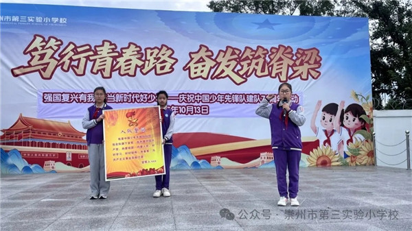 2025年10月13日,崇州市第三实验小学校“强国复兴有我 争当新时代好少年”建队节暨入队仪式在学校操场举行,全体师生共同参与了此次活动,见证新队员们加入中国少年先锋队这一光荣时刻。 仪式在庄严的升国旗仪式中拉开帷幕,随后出队旗,全体师生高唱队歌,歌声嘹亮,展现出新时代少年昂扬向上的精神风貌。 宣布新队员名单,老队员为新队员郑重地佩戴上红领巾,象征着责任与使命的传承。 在大队长沈铄涵的带领下,新队员们高举右拳庄严宣誓,坚定的誓言表达了他们对少先队组织的热爱与为共产主义事业奋斗的决心。 五年级三班进行了国旗下展示。 此次活动,不仅增强了少先队员的光荣感和归属感,也激励着全体队员勇担时代使命,努力成长为担当民族复兴重任的时代新人。(黄小林 通讯员 张悠槿 吴秀 胡艳蓉) |