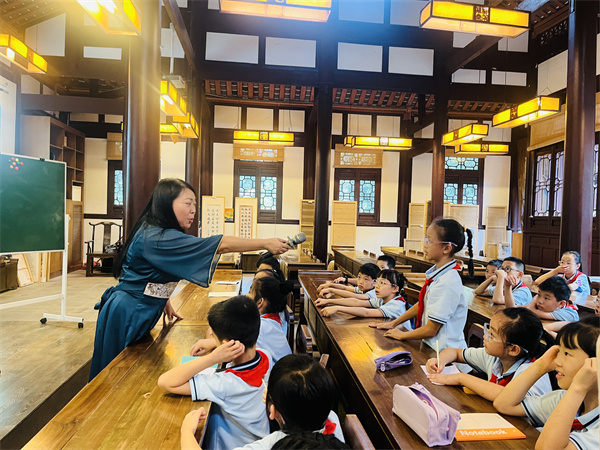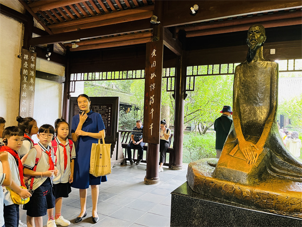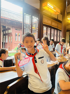 9月26日,秋光正好,成都市龙舟路小学的各班学生代表踏着晨露清辉,走进杜甫草堂。竹叶在微风中轻响,仿佛为这场期待已久的相遇奏响清音。 初入草堂,竹树环合,青石板路在光影斑驳间蜿蜒向前。孩子们沿着中轴线徐徐而行,大廨的庄重、诗圣雕塑的沧桑,在秋日的柔和光晕中更显厚重。细碎的脚步声与风声、竹叶声交织,恍若穿越千年的回响。 行至茅屋前,时光仿佛在此停驻。竹条砌墙,茅草覆顶,屋旁药草依然青翠。有孩子俯身轻触叶片,那跨越千年的生命律动,让诗圣躬耕采药、悬壶济世的身影渐渐清晰。 “安得广厦千万间,大庇天下寒士俱欢颜”——当这句诗在空气中回荡,孩子们凝神静听,诗人忧国忧民的胸怀,如涓涓暖流浸润心田。 “叠韵乐乐”课在仰止堂开启。老师一句“鱼摆摆”“吃嘎嘎”的川话叠词,瞬间点燃课堂。“杯杯”“盘盘”“巴巴掌”,孩子们学得兴致勃勃,这些充满生活气息的叠词,像跳跃的音符,在秋日的草堂里飞舞。 诗词中的叠字更让孩子们沉醉。“穿花蛱蝶深深见,点水蜻蜓款款飞”——当杜甫笔下的叠句被轻轻吟诵,那穿越时空的韵律美,让每个孩子都睁大了好奇的眼睛。 动手时分,创意飞扬。孩子们小心剪出心爱的乐器,与乐人形象巧妙组合。一个个穿越古今的“乐队”在巧手中诞生。欢声笑语中,刚学会的川话叠词不时迸发,让创作更添趣味。课程尾声,和着婉转的曲调,孩子们清脆的童声在草堂里回荡,与千年的诗韵水乳交融。 当孩子们手捧创意“乐队”作品,那些曾经停留在课本上的诗句,已化作草堂里的声声叠韵、片片竹影,深深印刻在心间。 穿过红墙竹影,出得园门,有孩子回头挥手,一句稚嫩的“下回再来耍哈”,为这场秋日诗旅画下温暖的句点。(江蕾) |