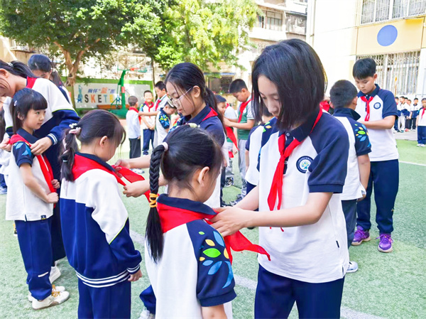 2025年10月13日,成都市实验小学青华分校举行了二年级分批入队仪式。学校党支部书记、少工委主任李忠云,团支部书记陈斌,德育主任王萌君,大队辅导员青玥含以及二年级各中队辅导员共同出席了本次活动,见证了一批新队员加入中国少年先锋队的光荣时刻。 下午两点,入队仪式在激昂的《出旗曲》中正式拉开帷幕。全体少先队员与辅导员神情肃穆,向队旗敬礼,展现了新时代少先队员良好的精神风貌。队旗飘扬,队歌嘹亮,全体师生齐声高唱《中国少年先锋队队歌》,表达了继承革命先辈光荣传统、为着理想勇敢前进的决心。 随后,李忠云、陈斌、王萌君共同宣布了新队员名单。高年级的老队员代表们为新队员佩戴上鲜艳的红领巾。这一刻,新队员们脸上洋溢着自豪与激动,互敬的队礼,是责任的传递,也是信念的传承。 紧接着,在青玥含的带领下,新队员们高举右拳,庄严宣誓。铿锵有力的誓言,在校园上空回荡,宣告着又一批祖国花朵正式加入了光荣的少先队组织。 李忠云向全体新队员发表讲话,他勉励新队员们要珍惜荣誉,爱护红领巾,以少先队员的标准严格要求自己,努力学习,团结同学,热爱劳动,锻炼身体,从小树立远大理想,培养优良品德,努力成长为能够担当民族复兴大任的时代新人。 最后,仪式进入了庄严的呼号环节,“准备着,为共产主义事业而奋斗!”“时刻准备着!”嘹亮的呼号声,表达了全体队员坚定的决心。 仪式虽已结束,但少先队员的光辉历程才刚刚开始。愿少先队员们肩负使命,勇敢追梦,成为新时代的好少年!(赖波) |