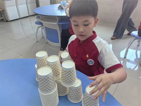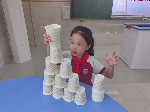 一张书桌、一叠纸杯,孩子们化身小小建筑师,动手实践搭建技巧。从直立堆叠到交错排列,纸杯塔逐渐成形。每个纸杯的安放,都蕴含着孩子们对未知的探索与尝试。