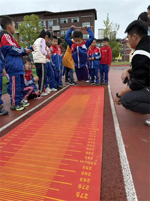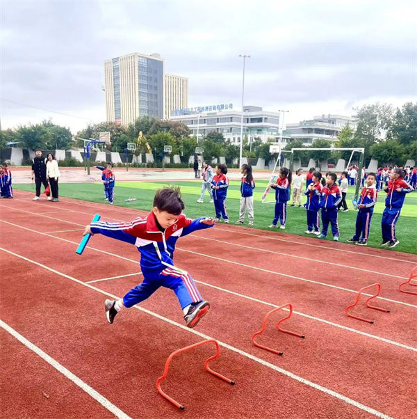 赛场瞬间 发令枪“砰”地划破晴空,红色跑道上,小运动员们像离弦的箭般冲出起点。助威声浪里,有人紧攥拳头奋力向前,有人不小心踉跄却立刻稳住脚步;跳远沙坑旁,踮脚、助跑、腾空,扬起的沙粒都跟着雀跃,整个操场,都浸在热气腾腾的拼搏里。 一、二年级30米趣味接力赛