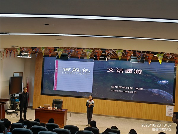 10月23日下午,成华区教科院副院长文波走进成都市双林小学御风分校,为六年级的同学们带来了一场别开生面的《西游记》专题讲座。这场讲座如同一把金钥匙,开启了通往经典深处的大门,引领同学们走进《西游记》中那些鲜为人知的奇幻秘境与文化深处。