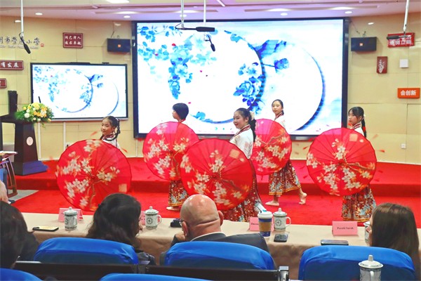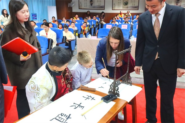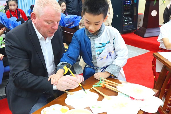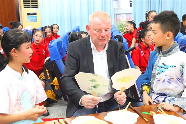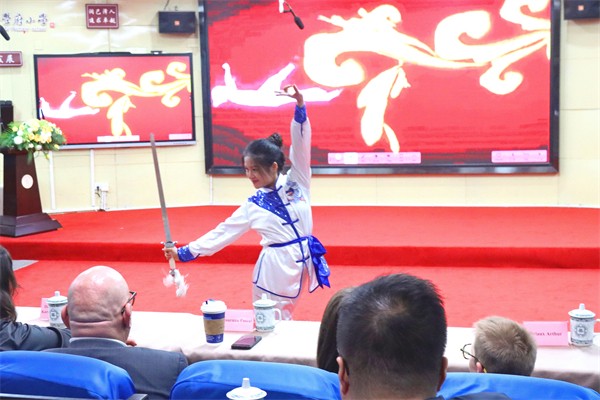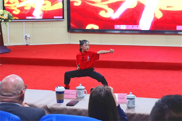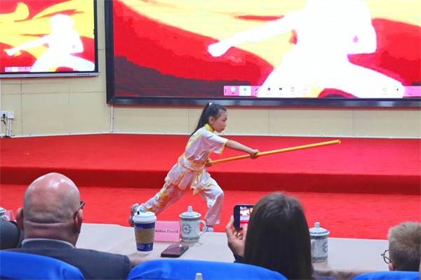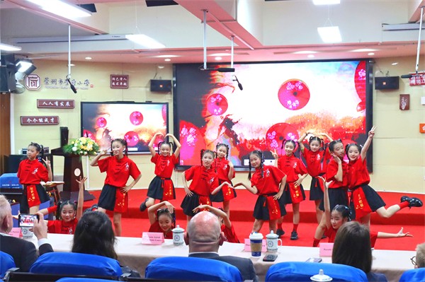 在文艺展演环节,学府小学的同学们以多元艺术形式展现了中华文化的独特魅力。活力四射的啦啦操表演彰显了当代中国少年的蓬勃朝气;舞蹈《青花瓷》以柔美舞姿演绎了中国传统陶瓷艺术的典雅与深邃;武术表演时,师生们刚柔并济的长拳、棍术与剑舞,生动传递了中华民族自强不息的精神品格;古筝演奏与书画创作相结合的表演环节,则让嘉宾们在墨香与琴韵中沉浸式感受中国传统文化的精神内涵。法国师生还应邀上台体验中国书法与绘画,亲身体验东方美学的意趣与哲思。