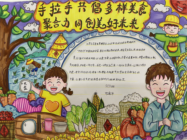 次日,“多样美食与美好未来”手抄报征集活动也同步进行。同学们用画笔和文字传递节约理念,优秀作品脱颖而出。