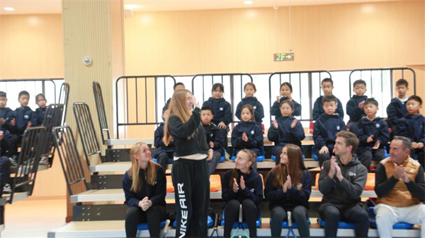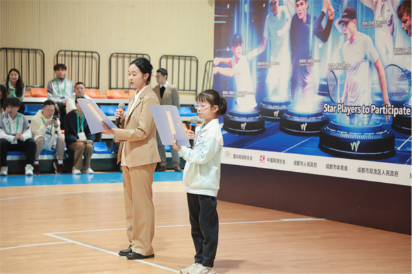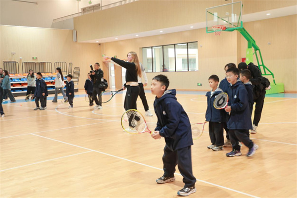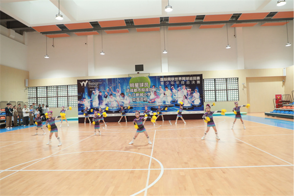 作为双流区教育局直属的高品质公办学校,九江新城小学自2023年9月启用以来,便以“创·生教育”为特色,深耕体育与教育融合之路。学校不仅拥有400米标准跑道、八大特色教育场景等优质硬件,更在体育特色领域持续突破——2023年成为成都市首个“匹克球进校园学校”,依托专业教学资源开展网球基础培养,如今学生已具备扎实的网球基本功,为本次国际交流奠定了绝佳基础。此次“网球明星进校园”活动,正是学校践行“体育与教育融合、网球与素质教育共生”理念的生动实践,也是对“培养有未来胜任力的时代新人”办学目标的有力诠释。 下午3时,活动在二楼体育馆正式拉开帷幕。活力四射的啦啦操表演瞬间点燃现场氛围,双语主持人(由学校英语教师李垚与三年级五班学生文思琪共同担任)依次介绍到场嘉宾。