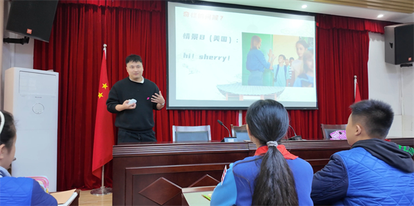 在见面礼仪环节,戴红色手环的“中方代表团”率先登场:面对扮演“长辈”和“同伴”的师生,他们纷纷双手交叠行拱手礼,身姿微微前倾,用清晰的汉语问候“叔叔阿姨好”“同学你好”,一举一动间尽显谦逊恭敬;而戴蓝色手环的“西方代表团”则面带微笑,主动伸出右手与“友人”轻轻交握,眼神真诚对视,同步说出“Nice to meet you”,部分同学还根据场景做出轻拥致意的动作。