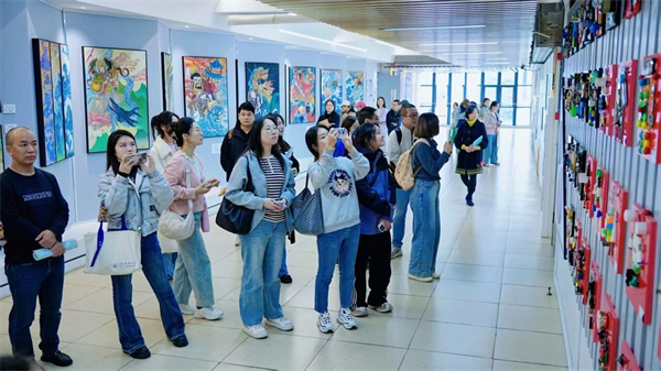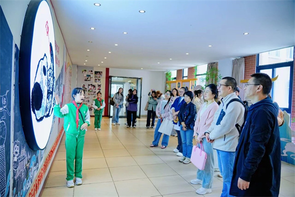 “沈琪美术名师基地”由正高级教师、特级教师沈琪带队,携卢亦宓、毛主等名校骨干;“陈肖前基地”在何晶晶老师带领下,与楼芳、顾晓雅等优秀教师一同,为都江堰美术教育带来前沿理念与实践智慧。 校园探秘:触摸美育的“人文温度” 漫步校园,处处可见美育的巧思:艺术长廊里学生创作的都江堰民间故事壁画、剪纸艺术、根果艺术等,让“美”成为触手可及的存在。