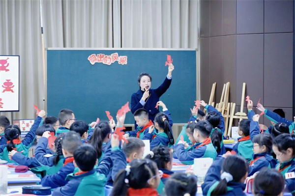 北街小学美术教师夏春芳呈现的《多彩民艺》现场课例,堪称一场视觉与思想的双重盛宴。课堂上,传统民艺元素(剪纸)与儿童天马行空的创意碰撞出奇妙火花:孩子们创作的胖娃儿变成了一个个有趣的抓髻,来到都江堰市灌区开展农事活动,让“传承”与“创新”在课堂上自然交融。