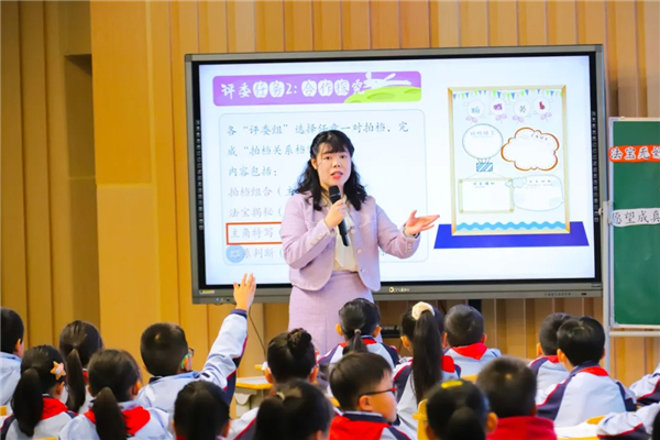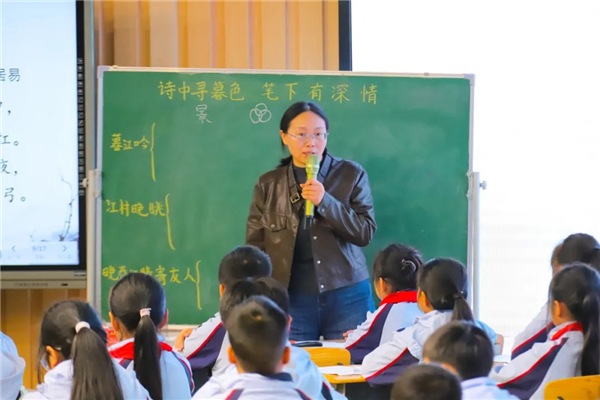 谢小兰老师执教《诗中寻暮色,笔下有深情》 赛后,杨明对本次比赛进行点评,提出了指导性建议。杨明首先赞美了湖小学子全程专注学习,语文素养高,能快速阅读多篇文本,提取信息,思维活跃,表达能力强。杨明强调群文阅读教学应聚焦议题,注重效率与实效;教师应引导学生掌握信息提取、逻辑推理与对比整合的方法,增强解题能力,注重培养学生的高阶思维。
