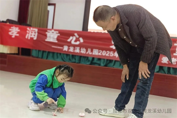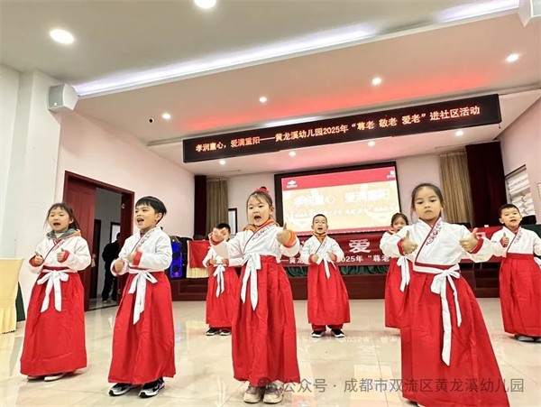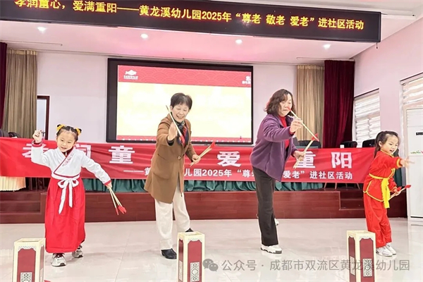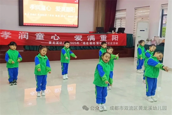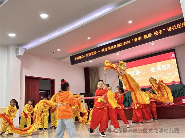 金风送爽,又逢重阳。为弘扬中华民族尊老、敬老、爱老的传统美德,让孝亲文化在孩子们心中生根发芽,2025年10月29日,成都市双流区黄龙溪幼儿园中大班的孩子们在老师的带领下一起走进嘉禾社区,用最纯真的方式,为社区的爷爷奶奶们送上了一份特别的节日祝福。 龙舞重阳 童心祝福 “祥龙”起舞,福满重阳。伴随着激昂的鼓点,幼儿园“小龙人”舞龙队惊艳亮相!孩子们精神抖擞,默契配合,两条小彩龙在他们手中翻腾起舞,充满了朝气与活力。这场独具传统文化韵味的表演,不仅赢得了爷爷奶奶们的阵阵掌声,更传递了孩子们最诚挚、最热烈的节日祝福。
