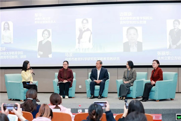 高峰圆桌环节,由四川开放大学余茂婷主持,成都市教育科学研究院学前教育教研员马波、吉利学院教育学院院长边保旗、咿薇托育公司教研运营部负责人黎华、民办集团园总园长张丽华围绕《智能技术如何重塑学前教育——从管理到育人的系统变革》这一主题展开了深度对话。会谈专家认为AI时代的到来势不可挡,如何做到人与人工智能相伴相生,需要教育工作者切实提升人工智能素养,以审慎、辩证、批判的观点正确运用AI技术。专家们还探讨了AI在儿童行为观察、家园共育、课程生成与管理增效等方面的应用前景,为现场从业者提供了丰富的实践参考。