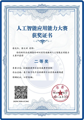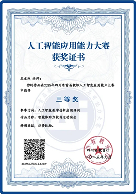 成果提炼,辐射共享 从“单点”走向“多面” 学校注重阶段梳理,强化工作闭环,既有计划实施,更有结果反思。同时作为四川省“网链共享计划”领军学校、成都市首批“人工智能+教学”试点校、成都市“人工智能+教学”典型场景试点校,学校积极开展辐射引领,助推优质共享。 在由四川省教育厅主办的首届教师人工智能应用能力大赛的1531个作品中,学校共斩获一等奖、二等奖、三等奖各1项,该赛事被视为检验教师人工智能应用能力的权威平台,成果将直接服务于教育质量提升和人才培养模式创新。