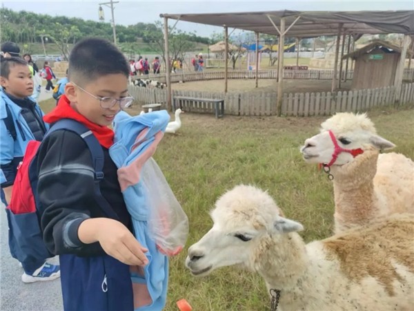 牧场互动:亲近生灵悟和谐 果乐牧场里,最吸引同学们的莫过于形态独特的火鸡、羽衣斑斓的孔雀和温顺可爱的小羊。火鸡拖着蓬松的尾羽昂首踱步,模样憨态可掬;孔雀时而梳理华丽的羽毛,时而展开尾屏,引得大家阵阵惊呼;小羊则依偎在围栏边,眼神温柔又灵动。同学们轻手轻脚地靠近,有的蹲在一旁静静观察火鸡的姿态,有的对着开屏的孔雀轻声赞叹,还有的温柔抚摸小羊柔软的绒毛,脸上满是欣喜与宠溺。大家用最轻柔的动作与小动物互动,眼神里满是对这些生灵的喜爱,在近距离接触中感受着生命的鲜活,真切体会到人与动物和谐共处的温暖。