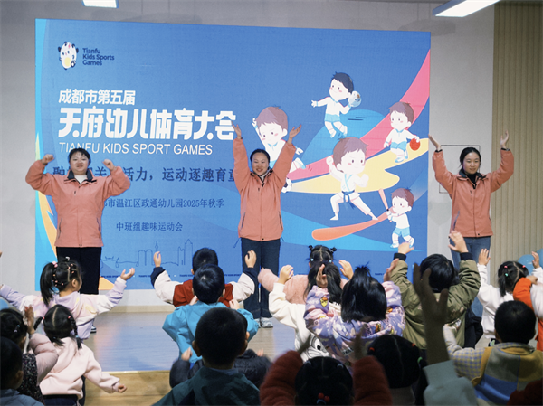 为积极贯彻落实中共中央、国务院《“健康中国2030”规划纲要》,体育总局、教育部《关于深化体教融合促进青少年健康发展的意见》,并结合成都市体育局、成都市教育局《成都市深化体教融合促进青少年健康发展的实施意见》《成都市3-6岁儿童习惯养成教育实施方案(试行)》等文件要求,进一步延展体育教育,助力中班组幼儿身心发展,成都市温江区政通幼儿园中班组于2025年11月7日举办了“融娃闯关展活力,运动逐趣育童心”主题运动会。 仪式启幕,热力开场 随着主持人清脆的宣布声,本次主题运动会正式拉开帷幕。欢快的热身音乐随即响起,孩子们跟着节奏伸展手臂、扭动身体,蹦蹦跳跳地活动关节,用饱满的热情为接下来的挑战做好准备。