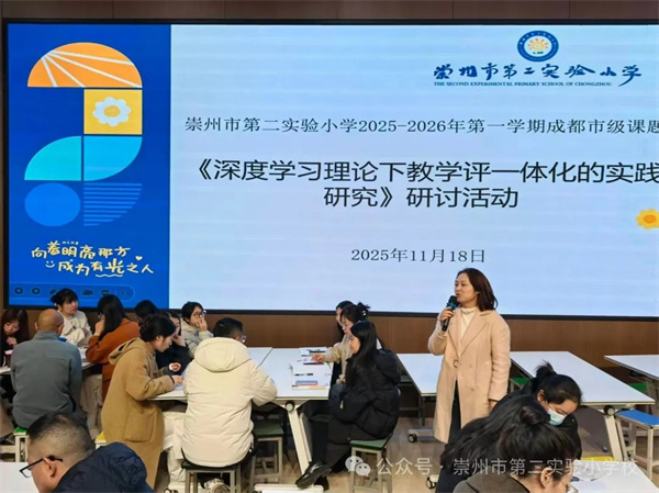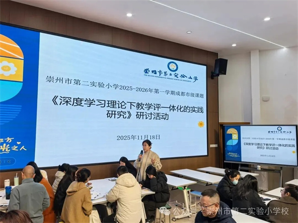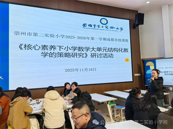 为深化课堂教学改革,推动成都市级课题《核心素养下小学数学大单元结构化教学的策略研究》《深度学习理论下教学评一体化的实践研究》研究走深走实,崇州市第二实验小学(以下简称:崇州实验二小)于2025年11月18日在学校明达厅开展数学教研专题活动。本次活动聚焦“大单元教学”与“小组合作学习”的融合实践,全体数学教师及课题组成员参与。