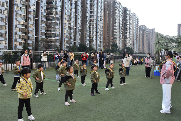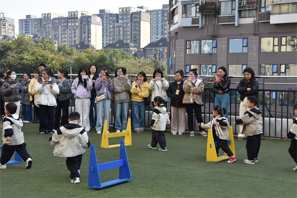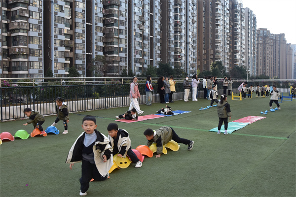 理论分享结束后,活动进入了现场观摩环节。参训教师来到四楼操场,观摩中班“体能大循环”活动。孩子们在教师精心设计的运动场地上尽情奔跑、跳跃、攀爬,脸上洋溢着运动的快乐和挑战的兴奋。观摩教师纷纷举起手机记录精彩瞬间,不时交流观察心得。