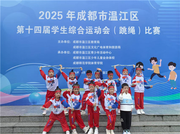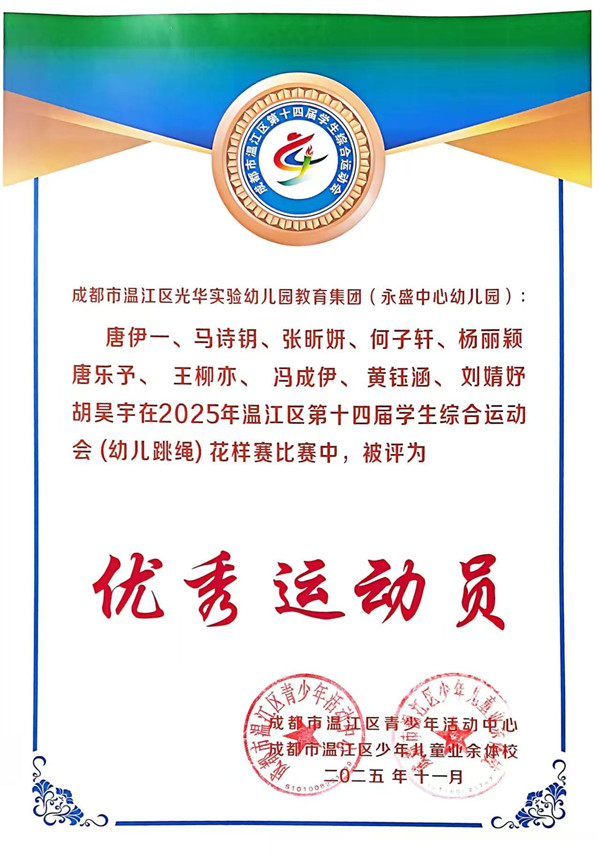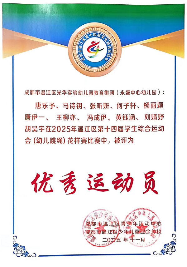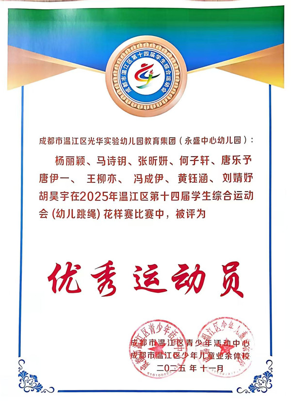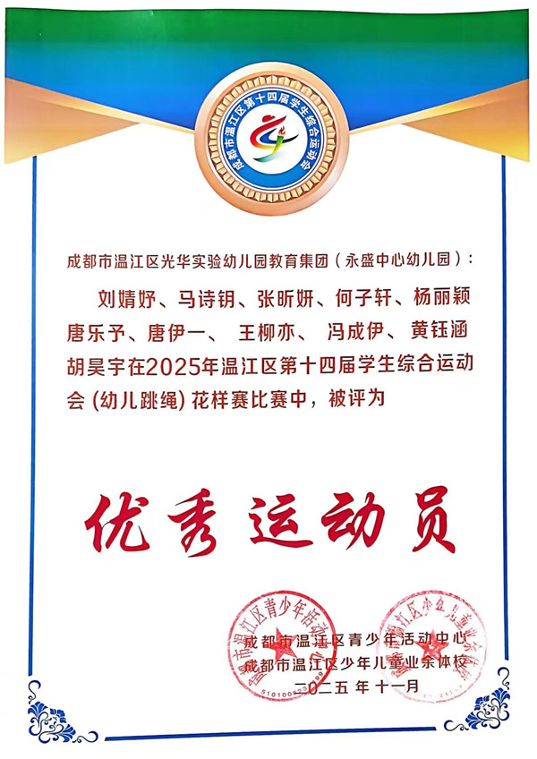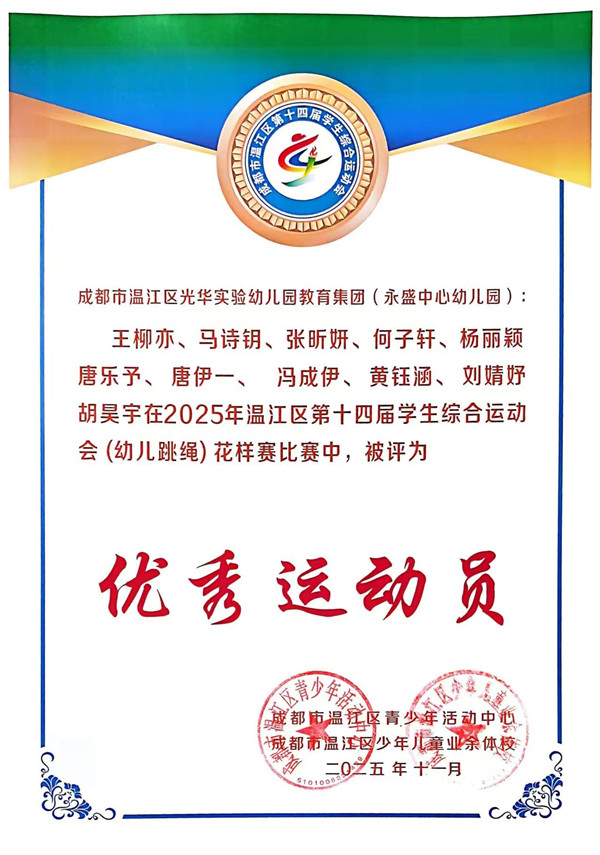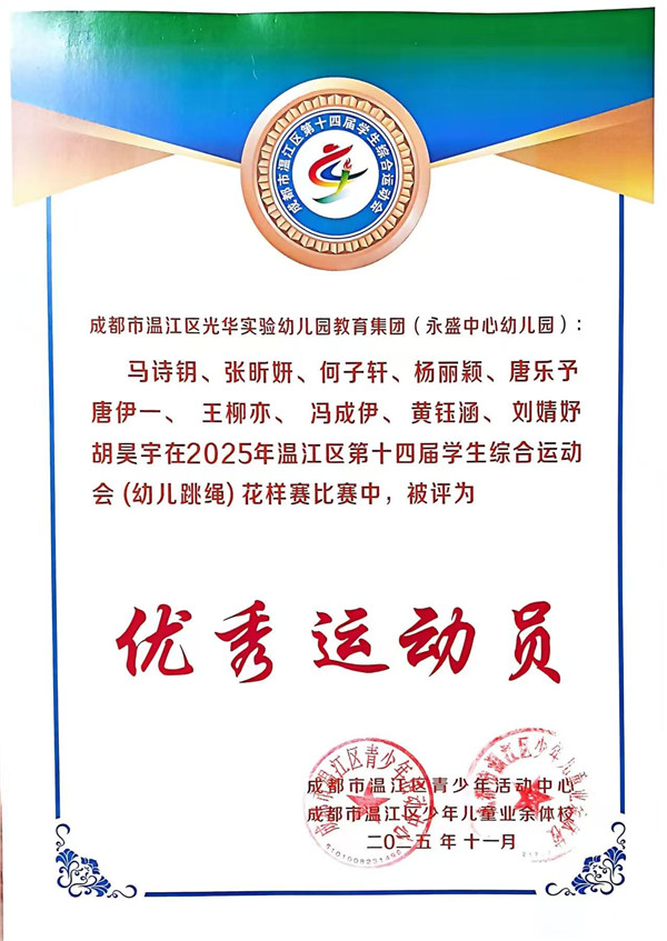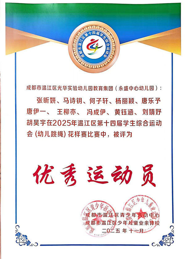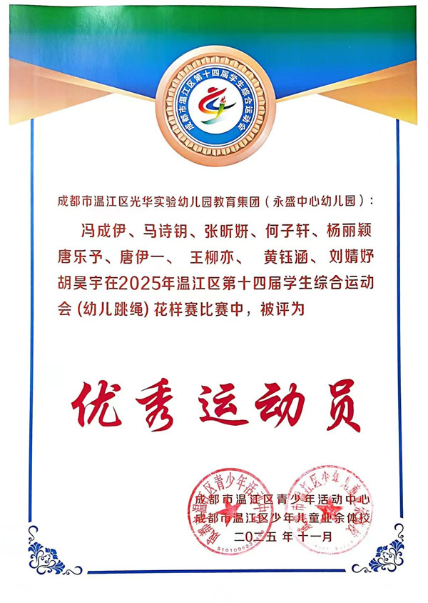 《3-6岁儿童学习与发展指南》中指出,幼儿的身心健康是其他领域学习与发展的基础,健康的身体和强健的体魄,是孩子敲开小学大门的“敲门砖”,更是他们迎接新挑战的“能量舱”。 2025年10月19日,成都市温江区永盛中心幼儿园12位小运动员参加了温江区第十四届学生综合运动会(跳绳)幼儿组比赛,在集体花样跳绳中荣获一等奖,在单摇接力跳绳和团体赛中荣获二等奖。