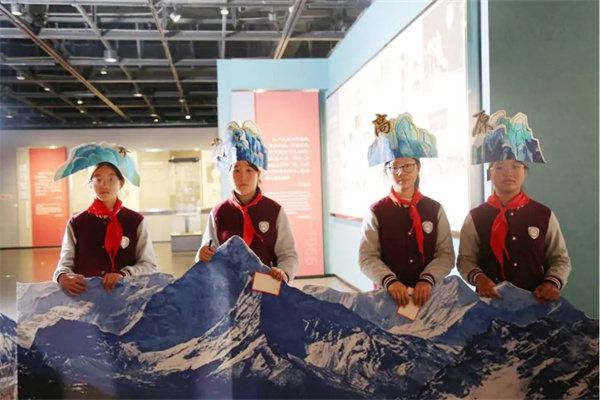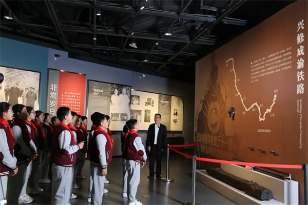 在成渝铁路展台,学生们齐诵《蜀道难》,通过“噫吁嚱,危乎高哉”的诵读感受蜀道之险。瞿代之引导学生用教具搭建四川周边地形模型,分析“东北山脉、西南高原”的地理屏障。围绕“蜀道为何难?”这一问题,同学们分组模拟蜀地周边的山地与高原,亲身体验到蜀地特殊地理环境导致的蜀道难。接着,两位老师带领同学们深入了解成渝铁路——新中国成立后自主修建的第一条铁路。在一段段铁轨枕木前,讲解员生动讲述当年筑路的艰辛历程与“人民铁路人民建”的感人故事,让同学们深刻体会到在邓小平同志等老一辈革命家带领下,军民团结一心、自力更生、艰苦奋斗,将天堑变通途的壮阔历史,让同学们深刻感受到邓小平爷爷心系人民的高贵品质,迎难而上的工作作风。