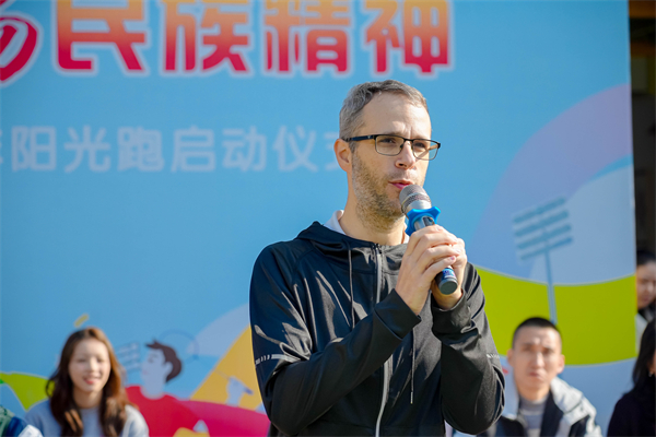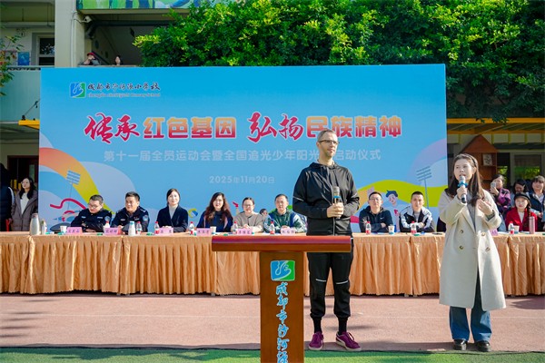 2025年11月20日,成都市沙河源小学校第十一届“传承红色基因 弘扬民族精神”全员运动会顺利举行。与往年不同,本届运动会迎来了一位特别的客人——法国友人Chris老师,他的到来为这场红色主题盛会注入了跨越国界的温暖与活力,也成为中法青少年人文交流的生动实践。 运动会在庄严的升旗仪式中拉开帷幕。全校学生按红、黄、蓝、绿四支队伍整齐列阵,伴随着激昂的运动员进行曲,各年级方阵精神抖擞地步入会场。从一年级小朋友稚嫩而坚定的步伐,到六年级学子自信昂扬的风貌,每个班级都用独特的方式展现着新时代少年的精神风采,也传递着红色基因在新时代的延续。 在“全国追光少年阳光跑”授旗仪式和运动员宣誓环节后,运动会迎来了温馨而富有意义的一幕——Chris登上主席台与全校师生见面。Chris特意身穿印有中国国旗的运动员服装,这一细节瞬间拉近了他与孩子们的距离,看台上响起了热烈而持久的掌声。
