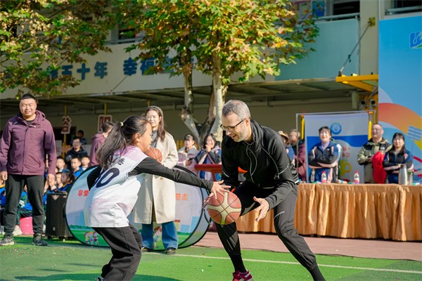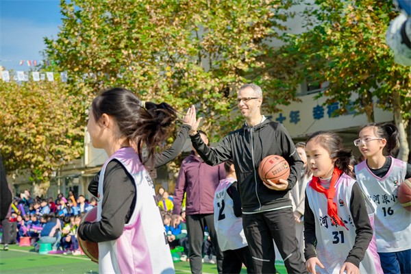 在随后的互动环节中,Chris积极参与到学生们的体育展演中。在“篮排竞跃·活力绽放”环节,他与小运动员们一起运球、传球、投篮,用篮球搭建起友谊的桥梁。尽管语言不同,但运动与笑容成为了最好的交流方式。更令人感动的是,Chris还专门与沙河源幼儿园的孩子们进行了亲切互动,耐心地蹲下身与小朋友们交流,展现了一位国际友人的细腻与温暖。