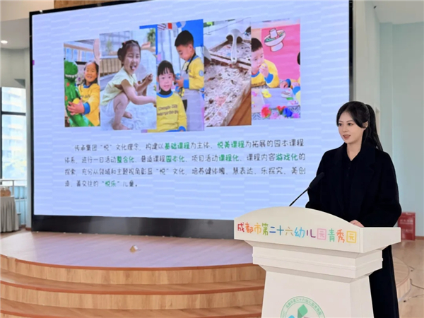 移步多功能厅,青秀园园点负责人季薇全面介绍了成都二十六幼教育集团的办园理念、发展历程、课程体系及师资建设、研培交流等方面成果,帮助新教师深入理解园所“悦”文化的内涵与实践。