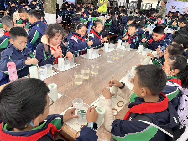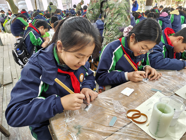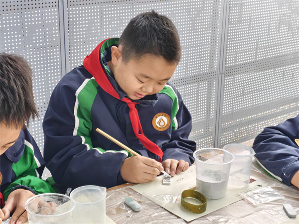 上午,同学们的热情与好奇被充分点燃。在古法制玉体验区,非遗传承人指导大家认识玉石原料、学习传统打磨技艺,从粗糙的玉料到初具雏形的小玉饰,每一次打磨都凝聚着同学们的专注与耐心,也让大家直观感受到古人“玉不琢不成器”的匠心与智慧。