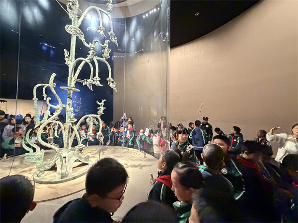 午后,同学们怀着好奇与敬畏之心来到三星堆遗址博物馆。当造型奇特的青铜神树、青铜大立人像、神秘的纵目面具等文物映入眼帘时,孩子们不由自主地发出阵阵惊叹。在讲解员的生动解说下,大家仿佛穿越时空,走进了三千多年前的古蜀王国,了解到古蜀先民精湛的青铜铸造技艺和独特的文化习俗。通过近距离观赏文物、聆听历史故事,同学们对古蜀文明的神秘感与厚重感有了深刻体会,爱国情怀与文化自信也油然而生。