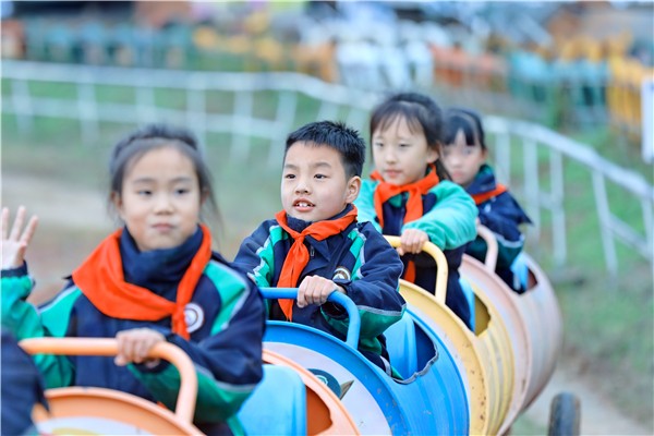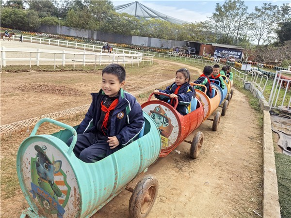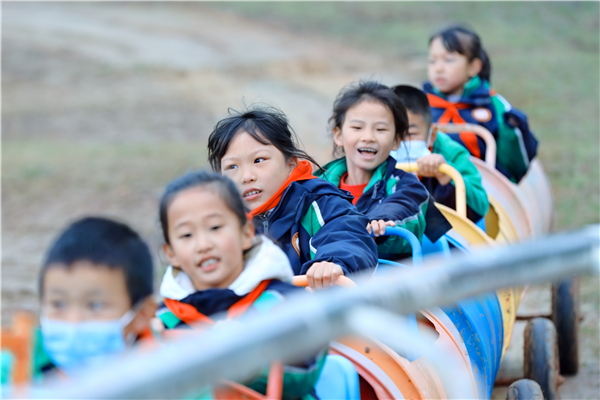“呜——”铁桶小火车鸣笛出发啦!小朋友们坐上色彩鲜艳的小火车,一路叮叮当当,脸上都洋溢着开心的笑容。小火车慢慢向前,把一路的美好风光和快乐都装进了童年的小口袋里!