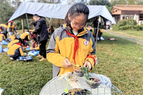 巧手造景,成果共赏 队员们利用苔藓、石块、枯木与多肉植物,制作微缩盆景,将保护湿地珍爱环境的环保理念带回家,根植于心。