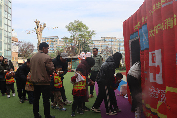 理论知识结束后,是亲子逃生帐篷体验。首先,消防教官向大家介绍逃生帐篷的设计以及相关作用。其次介绍了模拟烟雾的成分和相关作用。 幼儿在家长的带领下,按照年级组依次从“消防模拟帐篷”入口进入,并快速撤离消防帐篷。在漆黑的充满烟雾的模拟房屋帐篷里,家长用正确的方法带领孩子快速地找到出口。浓烟、黑暗的空间更磨练家长、孩子在紧急情况下临危不惧的意志和品质,让家长和幼儿真真切切体验一次消防安全逃生技能。