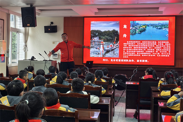 古今双舟,文脉与竞技交融。课堂上,胡森斌以生动通俗的语言,分别从龙舟与赛艇的起源、特点以及龙舟与赛艇的异同等方面展开讲解:龙舟是中国古老的优秀民俗运动,承载着千年文化底蕴,而赛艇是现代划船运动,自1900年起便成为奥运会常设项目。胡森斌通过对比两者的乘坐人数、滑行方式,强调龙舟注重团队协作,赛艇则兼具竞技性与规范性,并结合历史背景分析了龙舟暂未列入奥运项目的原因,让学生既了解运动知识,也深化了文化认知。